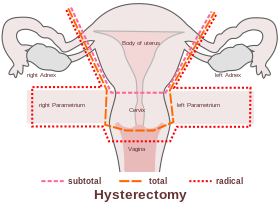 هیسترکتومی رادیکال (گسترده): در این جراحی تمام رحم، دهانه رحم، بافت دو طرف دهانه رحم و بخش بالایی واژن برداشته می شوند. هیسترکتومی گسترده اغلب برای درمان انواع خاصی از سرطان مانند سرطان گردنه رحم انجام می شود. لوله های رحم و تخمدان ها ممکن است بسته به شرایط برداشته شوند.